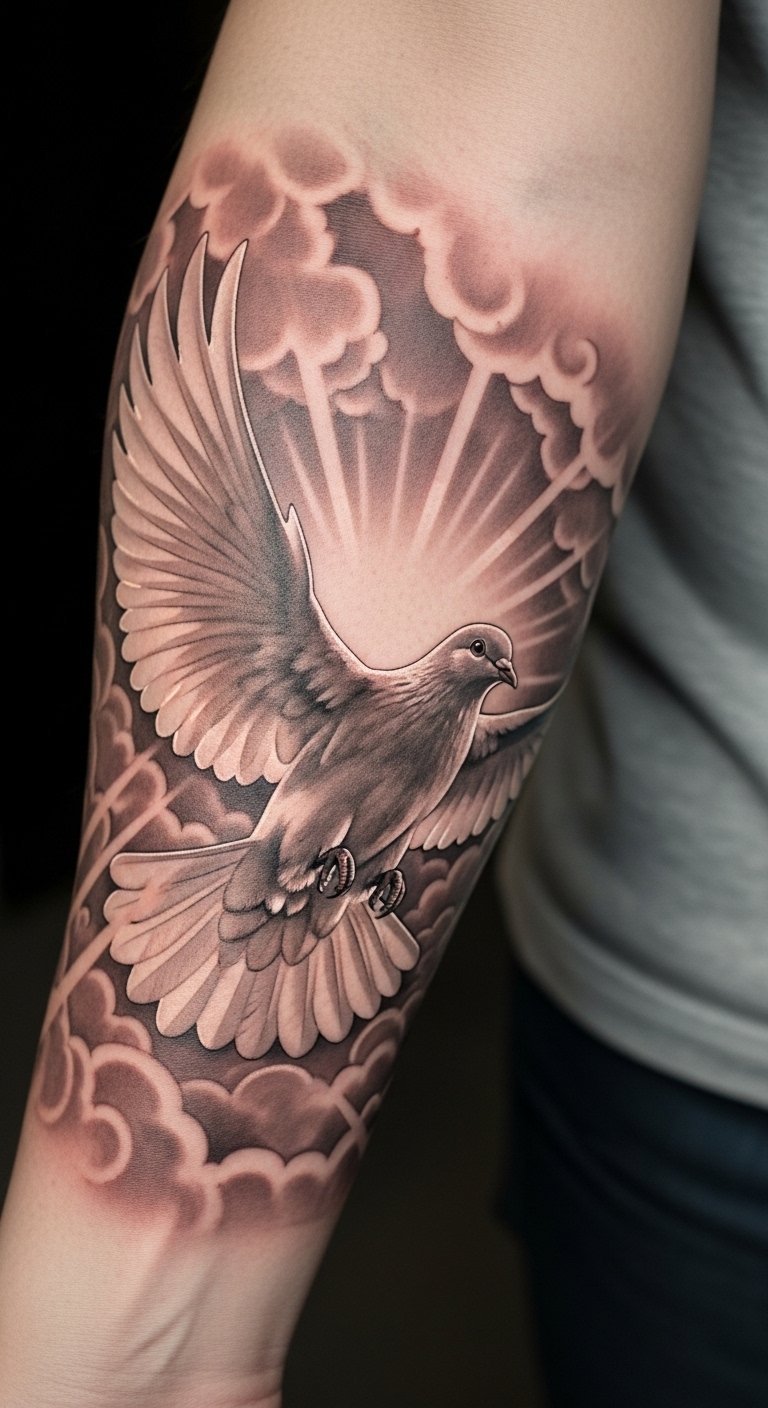 This tattoo design embodies the serene essence of the dove, a powerful symbol of the Holy Spirit.
