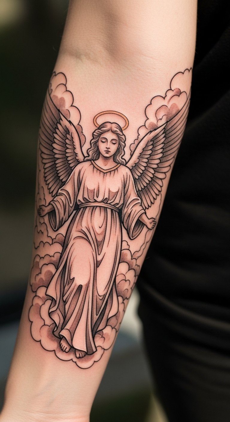 The soft clouds and halo add a layer of ethereal beauty, reflecting the spiritual journey one undergoes when contemplating a tattoo.