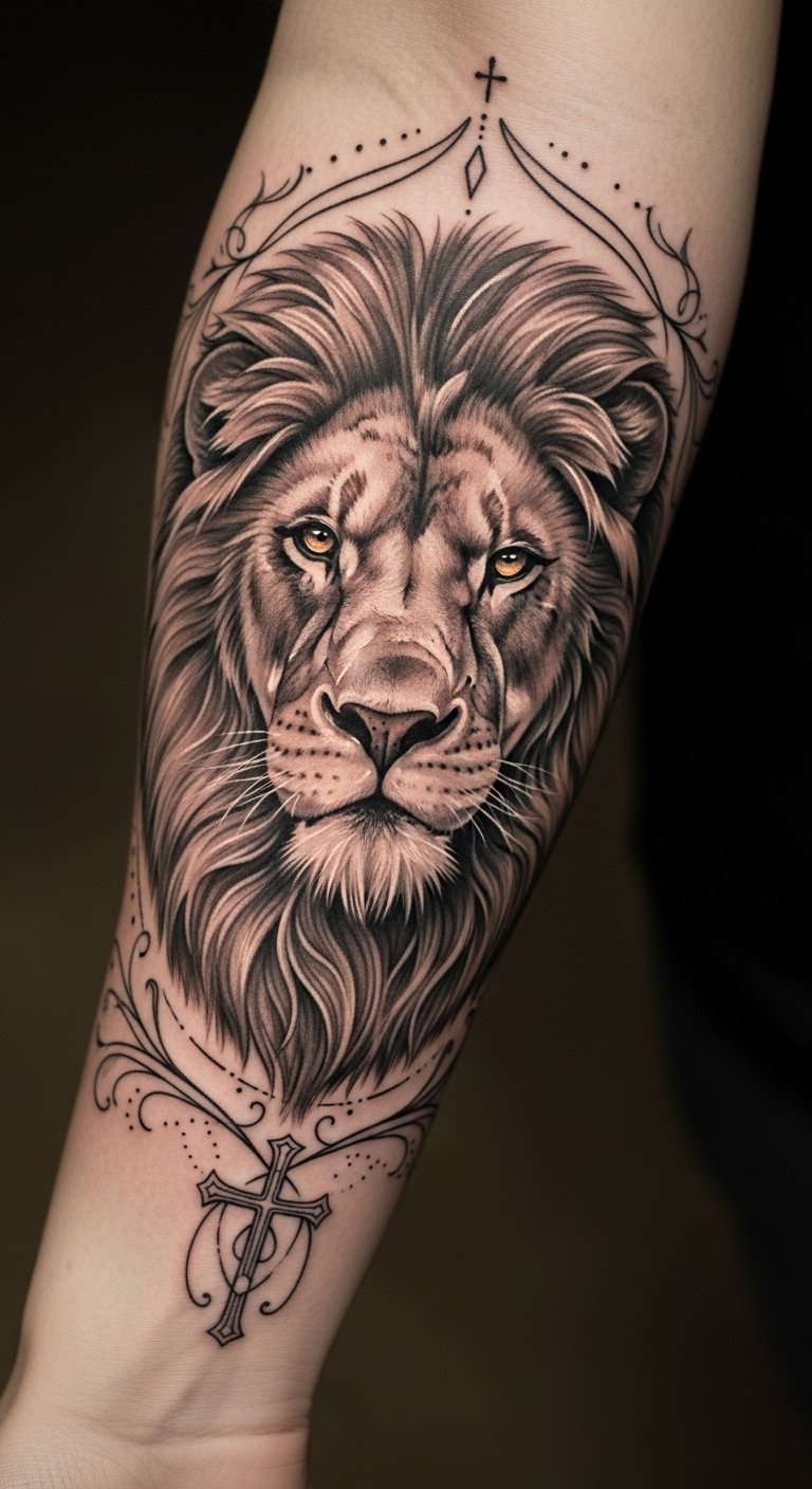 This tattoo symbolizes courage, strength, and unwavering faith, embodying the essence of the Lion of Judah.