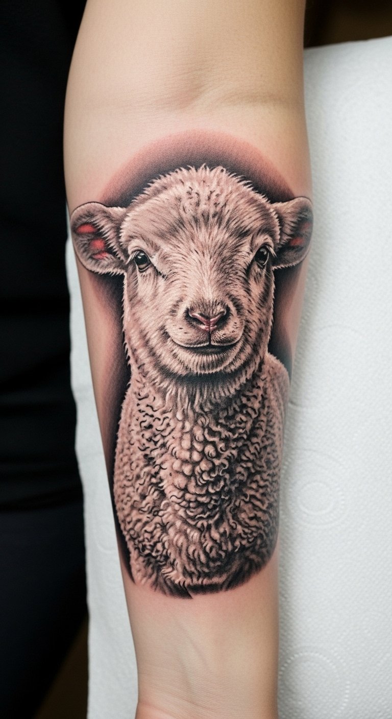 The lamb tattoo symbolizes innocence and sacrifice, representing Christ’s ultimate offering for humanity.