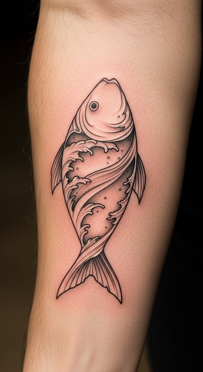 The Ichthys tattoo on the forearm serves as a meaningful expression of faith, connecting the wearer to early Christians who utilized this symbol for discreet affirmation of their beliefs.