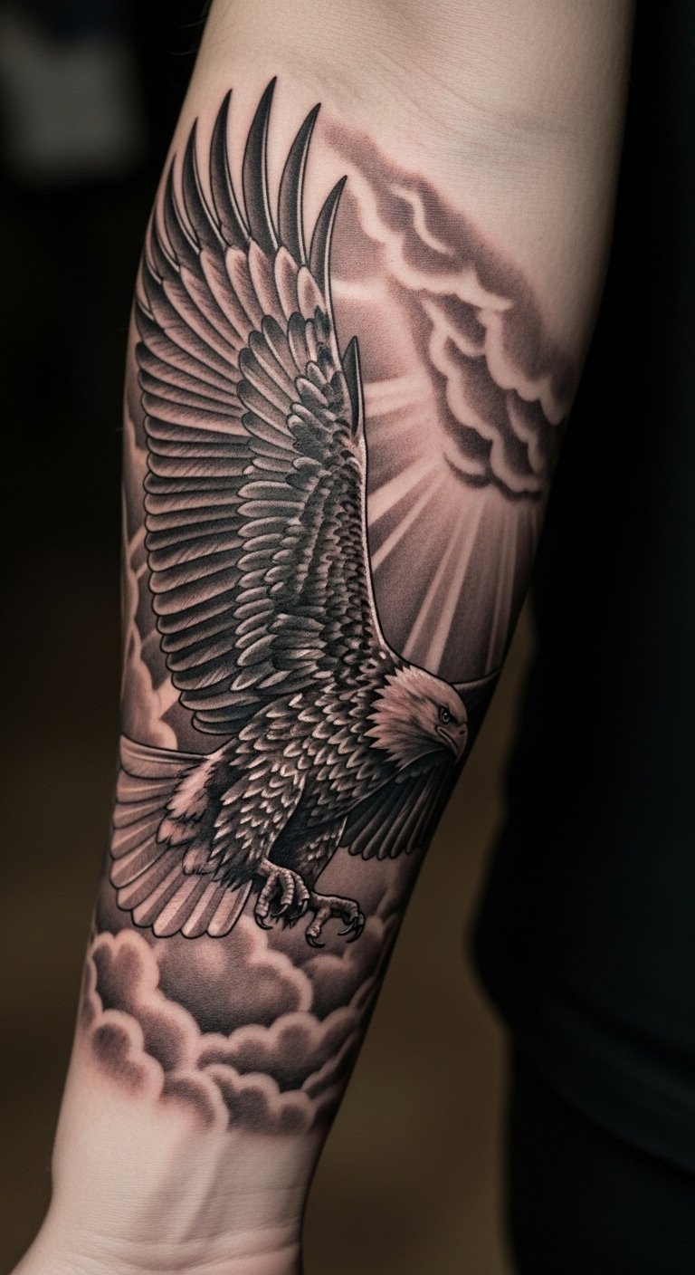 This tattoo embodies the themes of strength and renewal, with the eagle symbolizing spiritual vision and resilience.