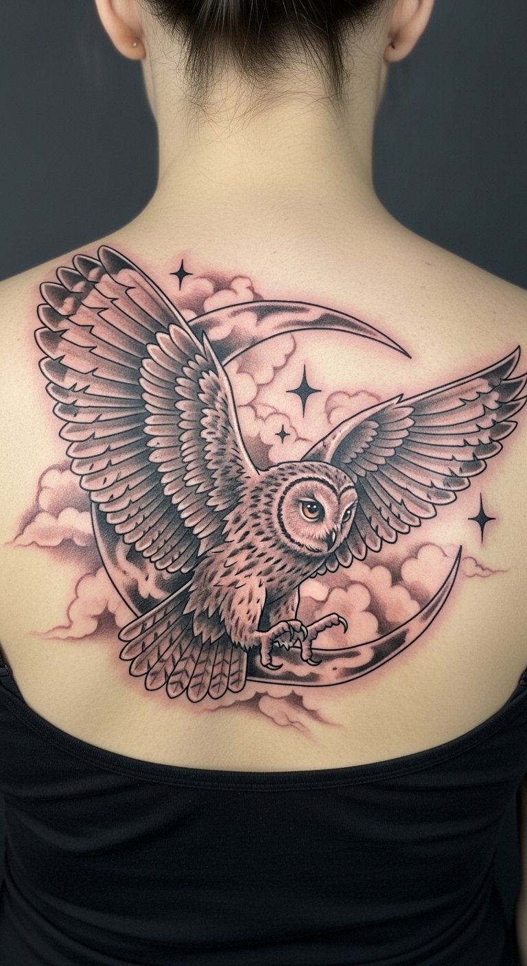 Positioned on the upper back, this tattoo serves as a personal reminder of the wisdom one carries, encouraging reflection and connection with nature.
