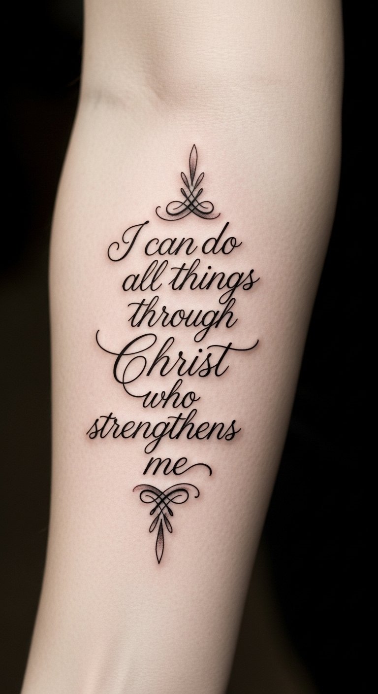 This tattoo embodies resilience and faith, serving as a constant reminder of strength drawn from Christ.