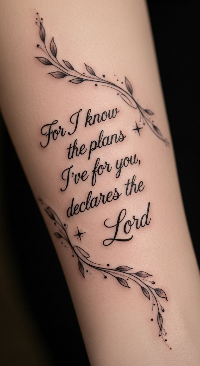 This tattoo symbolizes the unique journey of faith and purpose that each person carries. The verse serves as a constant reminder of divine guidance and assurance, embodying hope during challenging times.