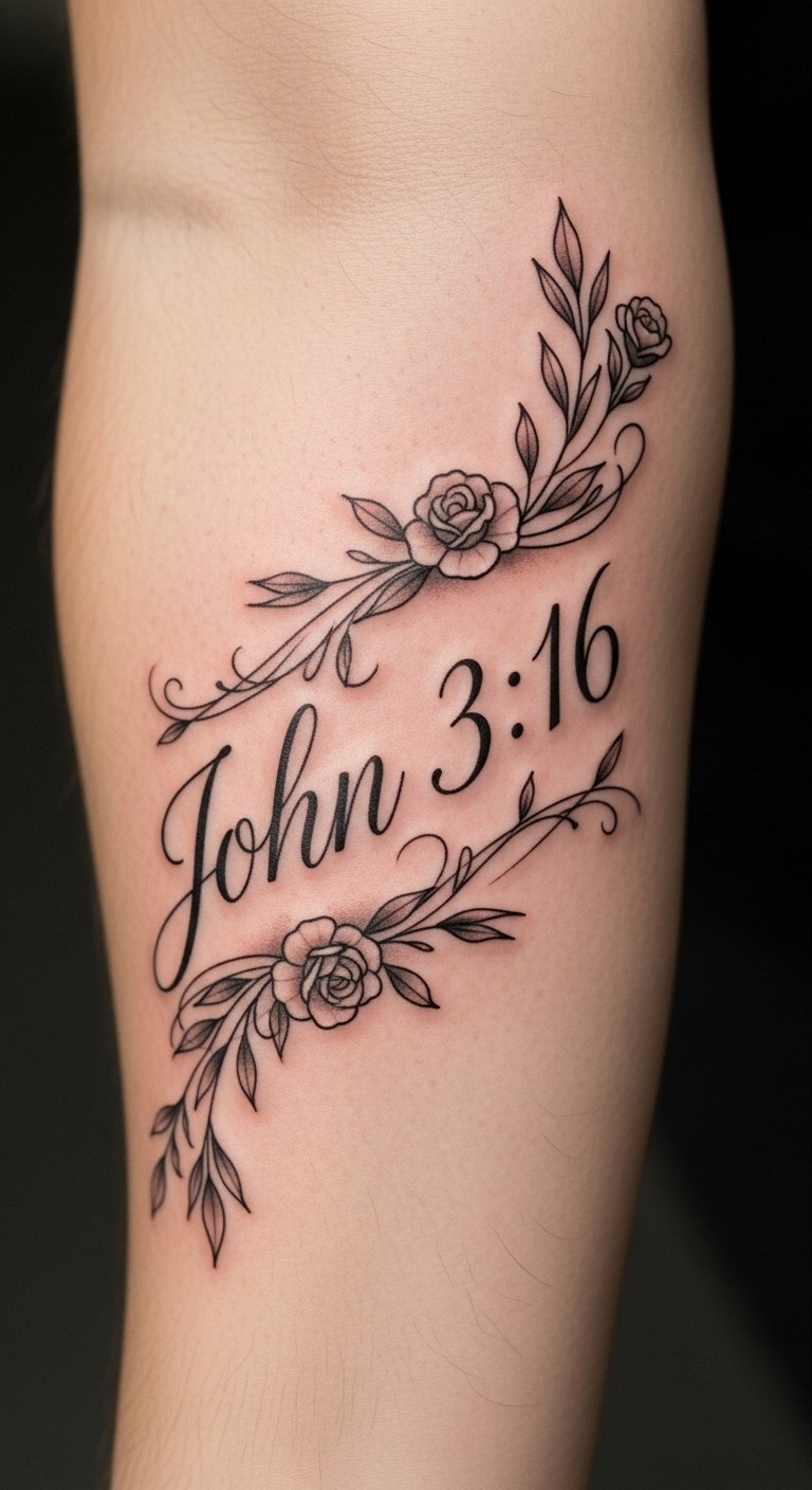 This tattoo captures the essence of God’s love through the elegant inscription of John 3:16, symbolizing Divine Affection and Sacrificial Grace.