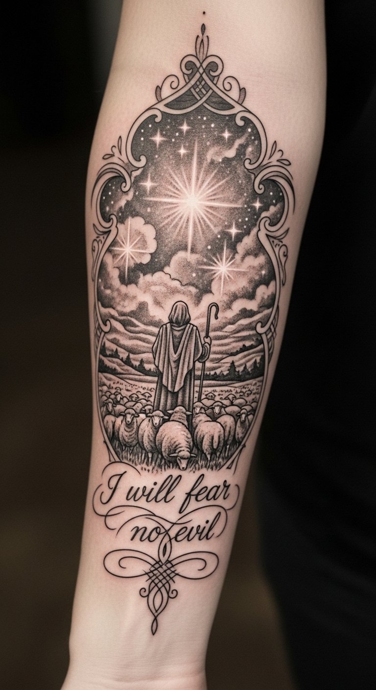 The tattoo symbolizes guidance and protection, embodying the essence of Psalm 23. The shepherd represents divine care, while the flock signifies community and support.