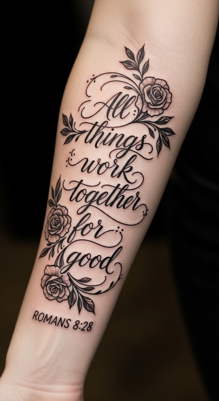 This tattoo design embodies faith and trust in God’s purpose, serving as a daily reminder of divine guidance and the belief that every challenge leads to growth. Placed on the forearm, it allows for easy visibility, encouraging both self-reflection and conversation about the significance of the verse. The floral elements represent the beauty that can arise from life’s trials, making it a deeply personal and meaningful expression of one’s spiritual journey.