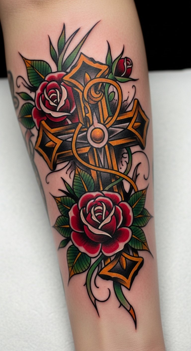 This tattoo symbolizes the intersection of faith and beauty, with the cross representing Christian devotion and the roses embodying love and sacrifice.