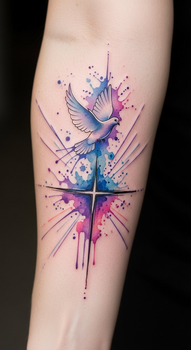 The dove’s flight represents a spiritual journey, making it a meaningful addition to one’s personal expression of belief.