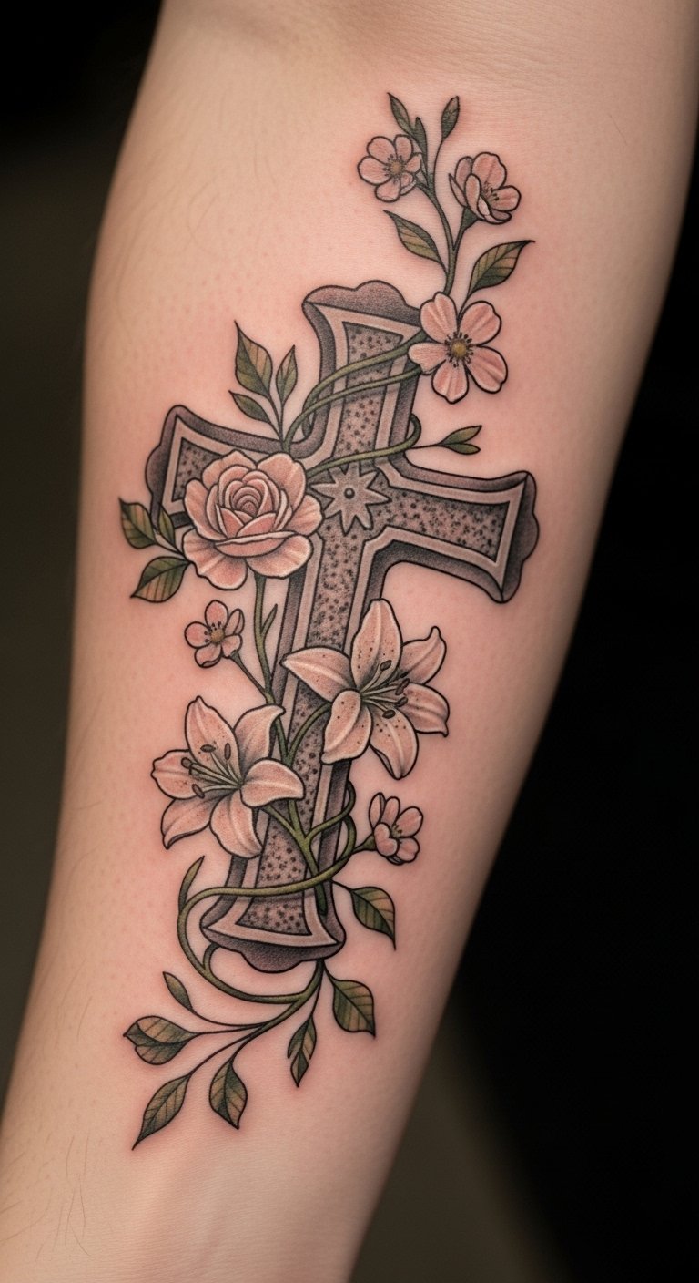 This tattoo symbolizes the intertwining of faith and personal growth, reflecting the journey of self-discovery in Christ. The cross represents the foundation of one’s beliefs, while the blooming flowers signify the beauty that emerges from spiritual growth and transformation.