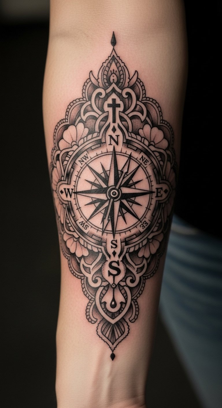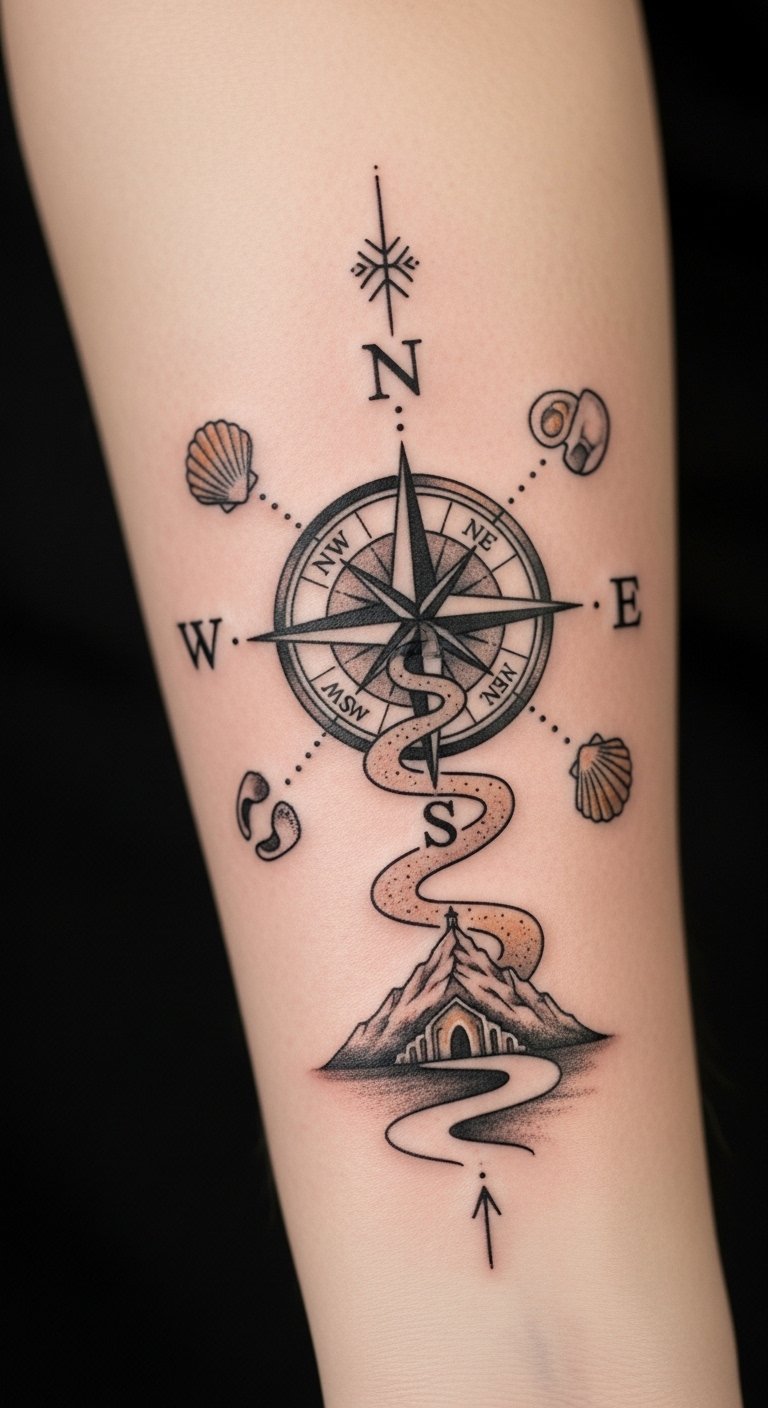This tattoo design symbolizes the journey of one’s spiritual path, with the compass representing guidance and direction in faith.
