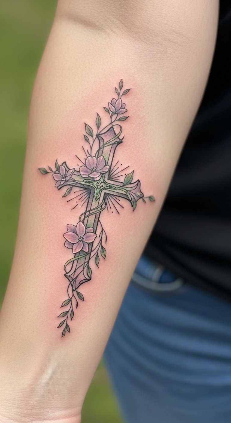 This tattoo symbolizes the intertwining of faith and personal growth, with the cross representing foundational beliefs while the vines and flowers signify life’s journey and blossoming spirituality.