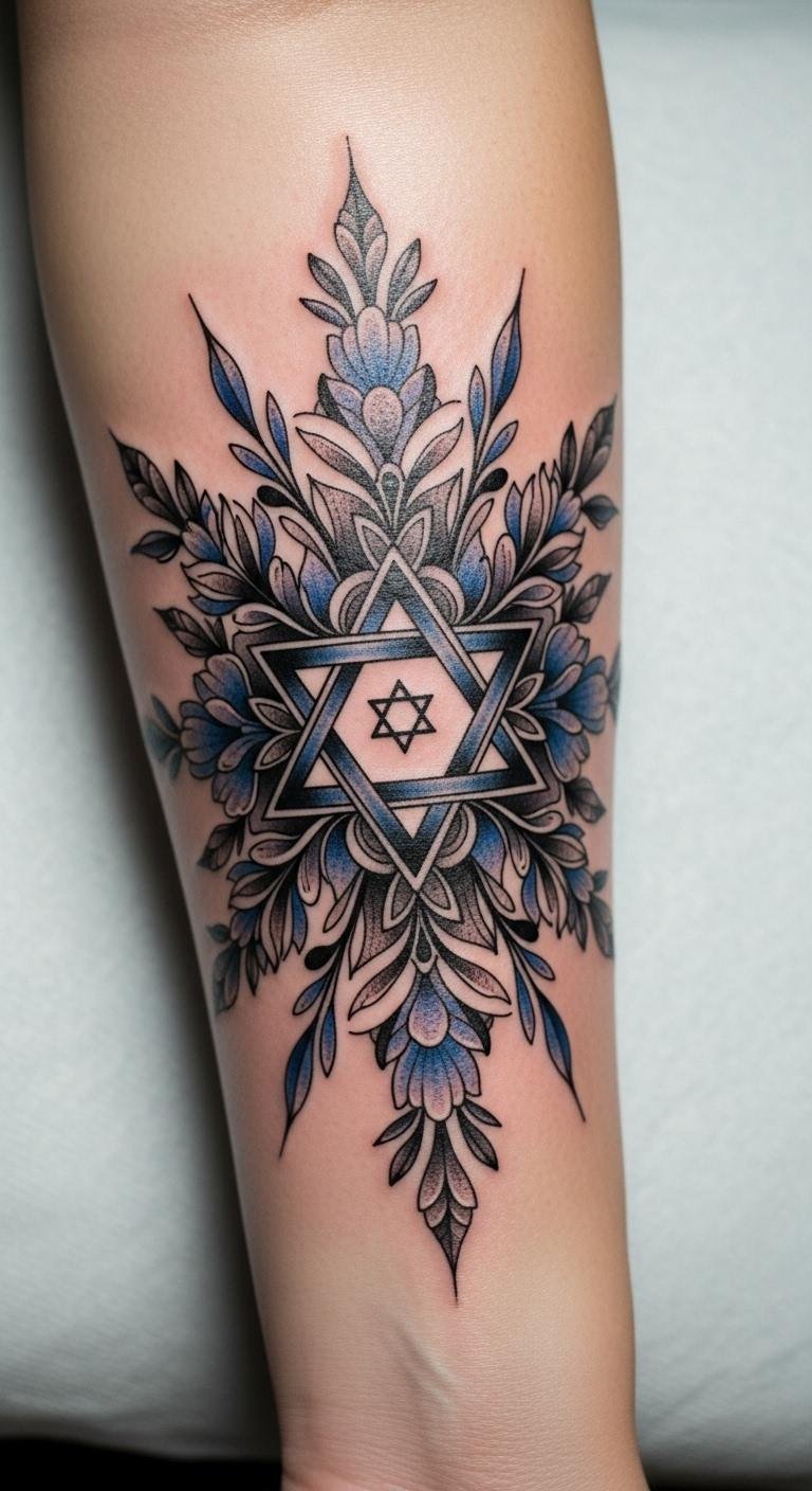 This tattoo embodies the rich interplay between tradition and modernity in Jewish identity. The Star of David signifies a deep-rooted connection to Jewish heritage, while the surrounding floral motifs suggest personal growth and artistic expression.