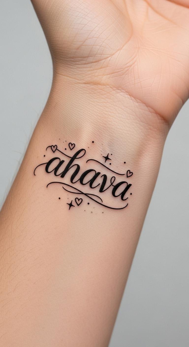 This tattoo embodies the concept of love and connection through the Hebrew word “Ahava,” symbolizing a deep emotional bond.