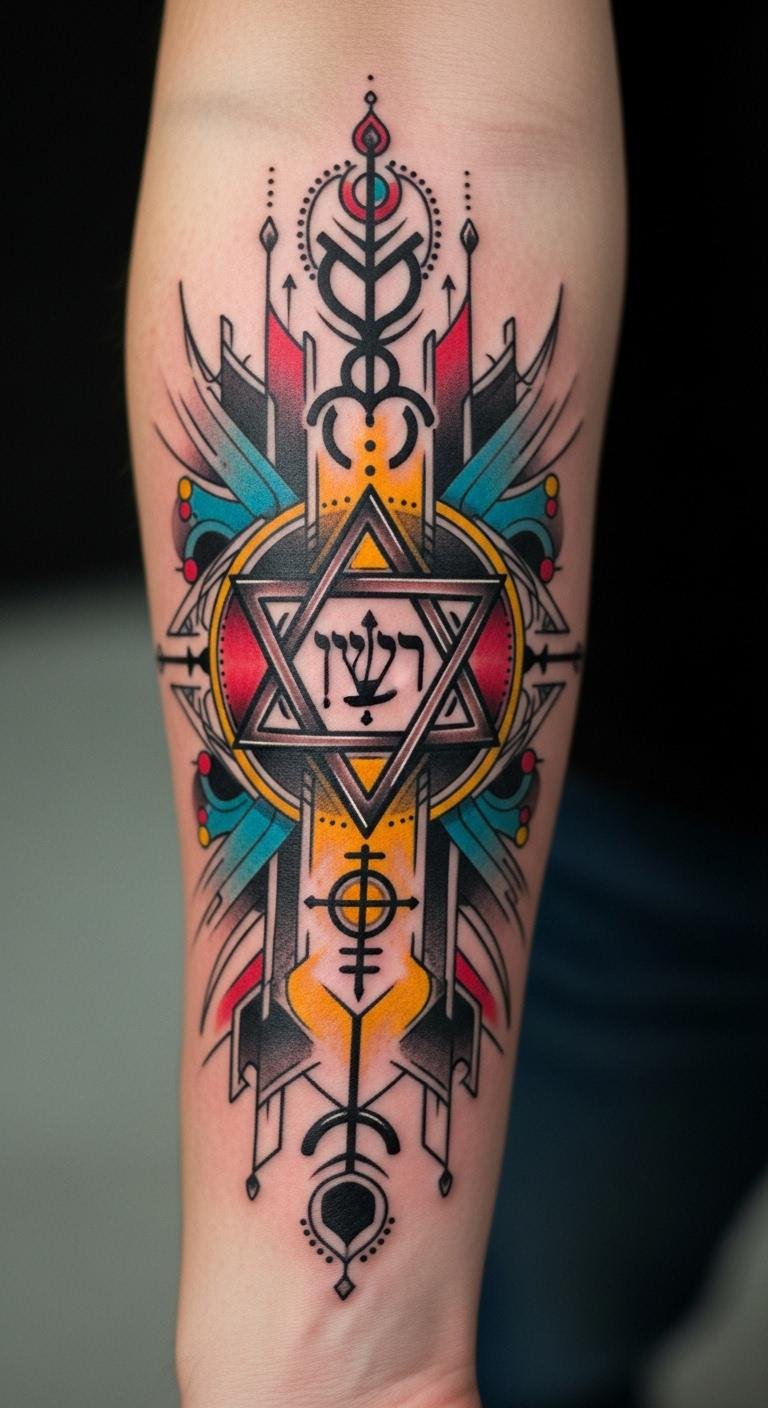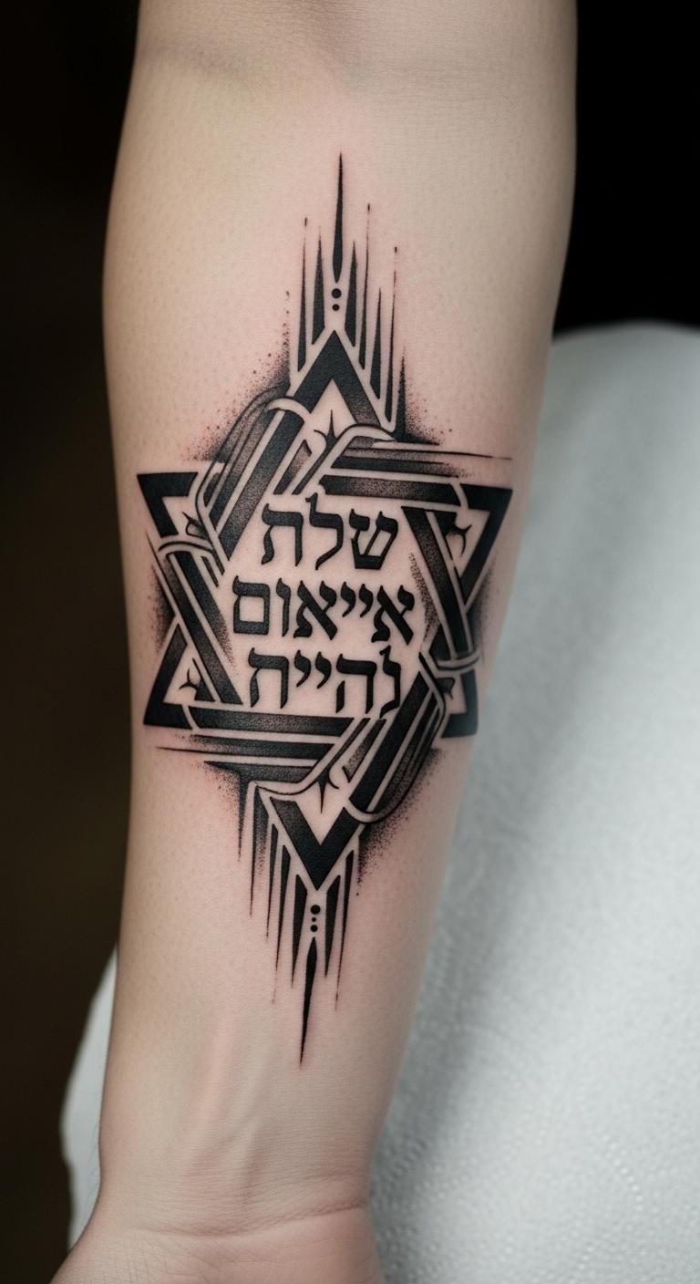 This tattoo represents a deep connection to heritage and spirituality, merging traditional Hebrew symbols with contemporary artistry.