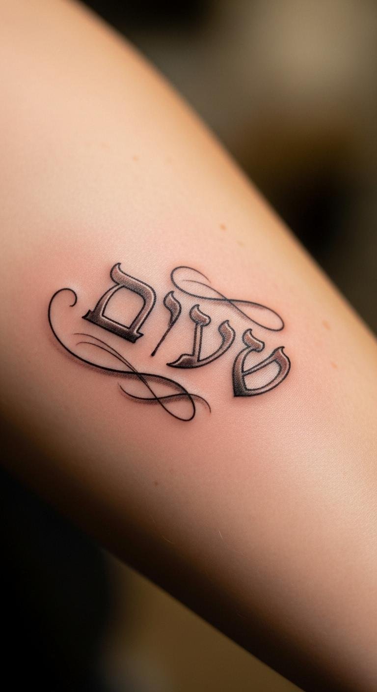 The “Shalom” tattoo symbolizes a deep commitment to peace and tranquility, serving as a constant reminder of the journey towards inner harmony.