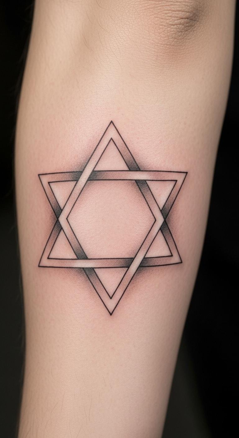 This tattoo of the Star of David on the forearm serves as a powerful reminder of unity and shared faith. Positioned prominently, it invites connection and conversation, reflecting a commitment to Spiritual Unity.