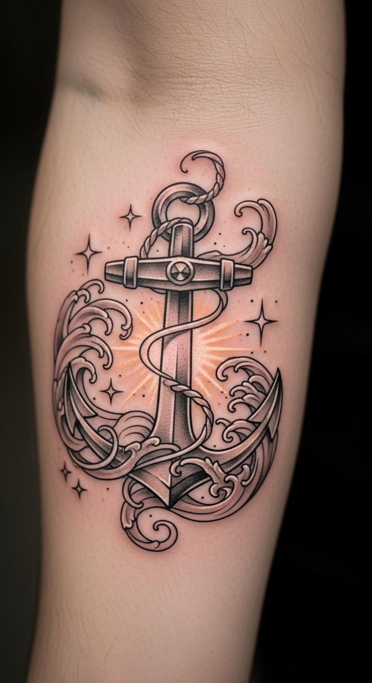 This anchor tattoo embodies faith as a powerful symbol of security, reminding the wearer of their resilience amidst life’s challenges.
