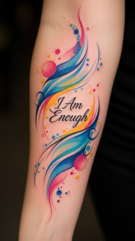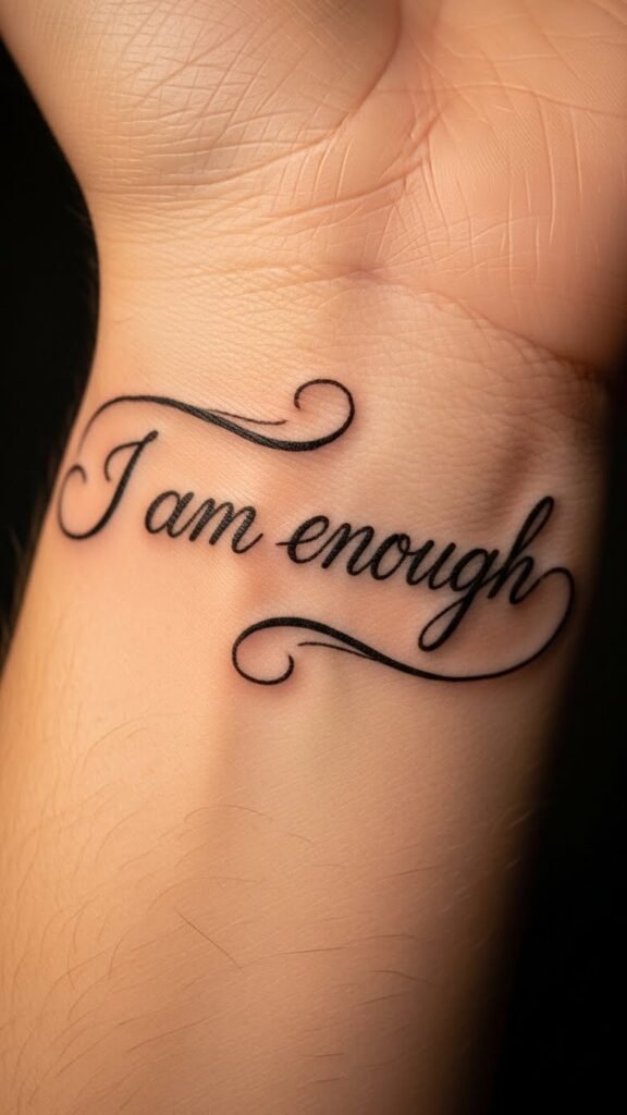The placement of the “I am enough” tattoo on the wrist serves as a constant reminder of self-worth and love, easily visible in everyday life.