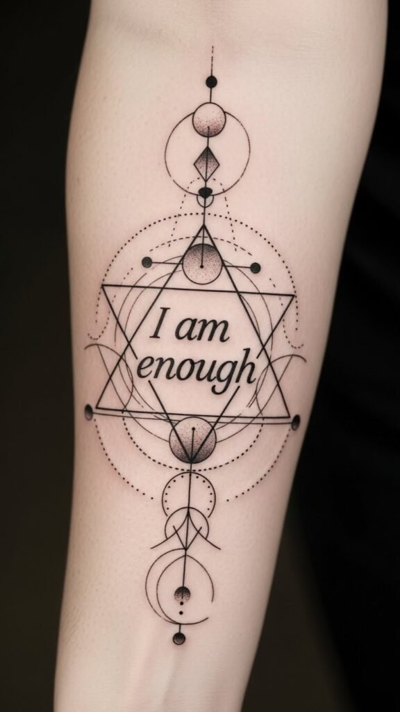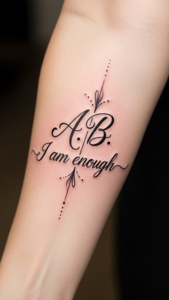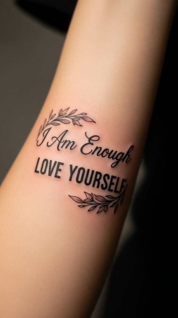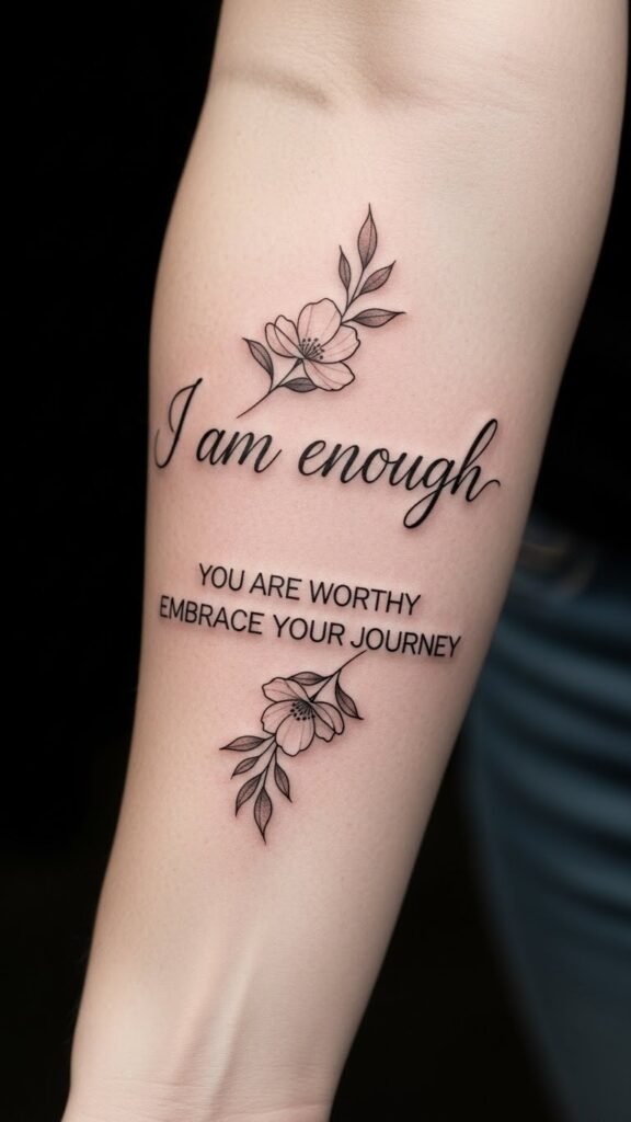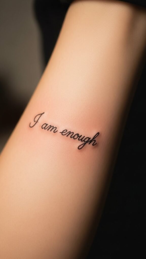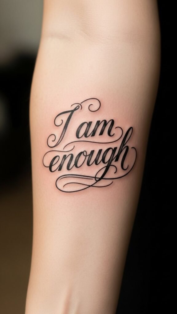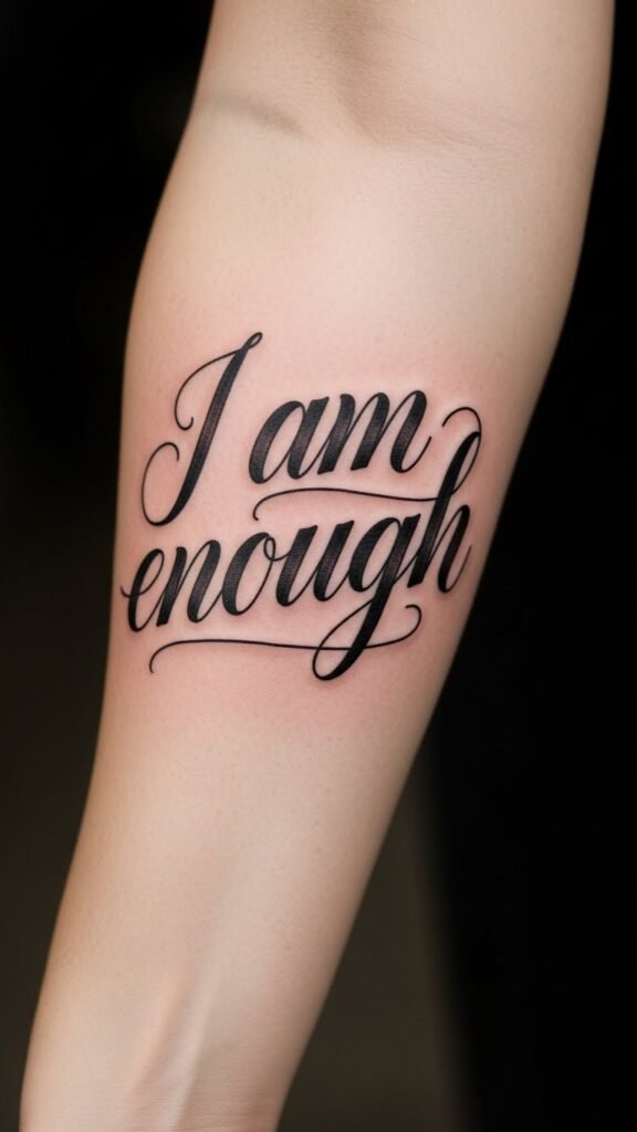 The phrase “I am enough” embodies the journey of overcoming self-doubt and embracing one’s worth. Its placement on the forearm allows for easy visibility, turning the skin into a canvas of empowerment and inspiration.