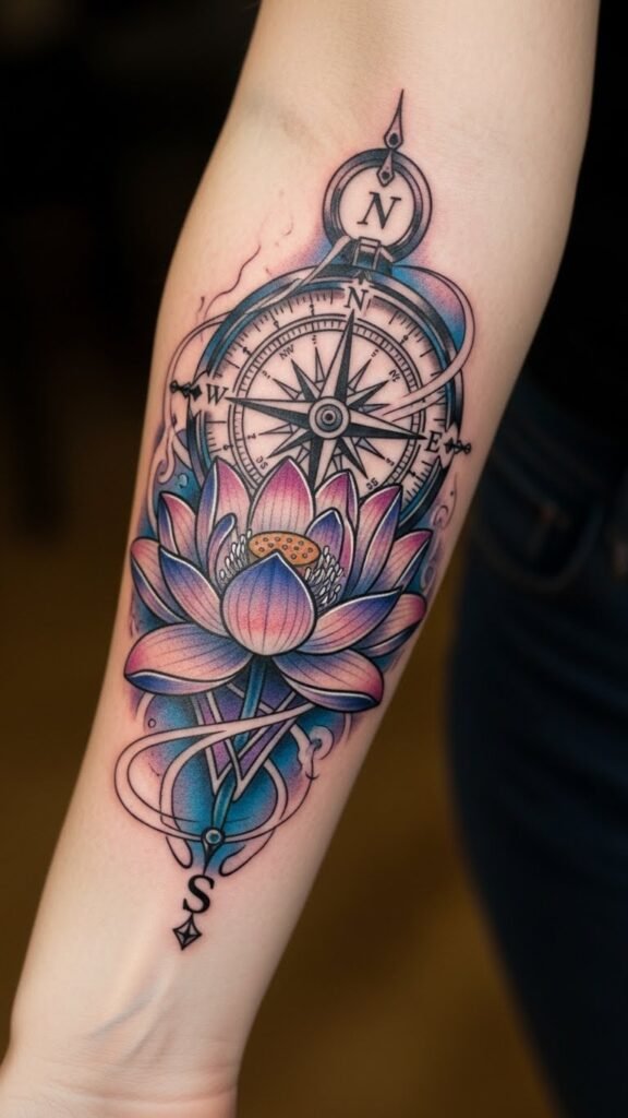 The combination of the compass and lotus signifies the wearer’s unique path, celebrating both their individuality and the transformative experiences that have shaped them.