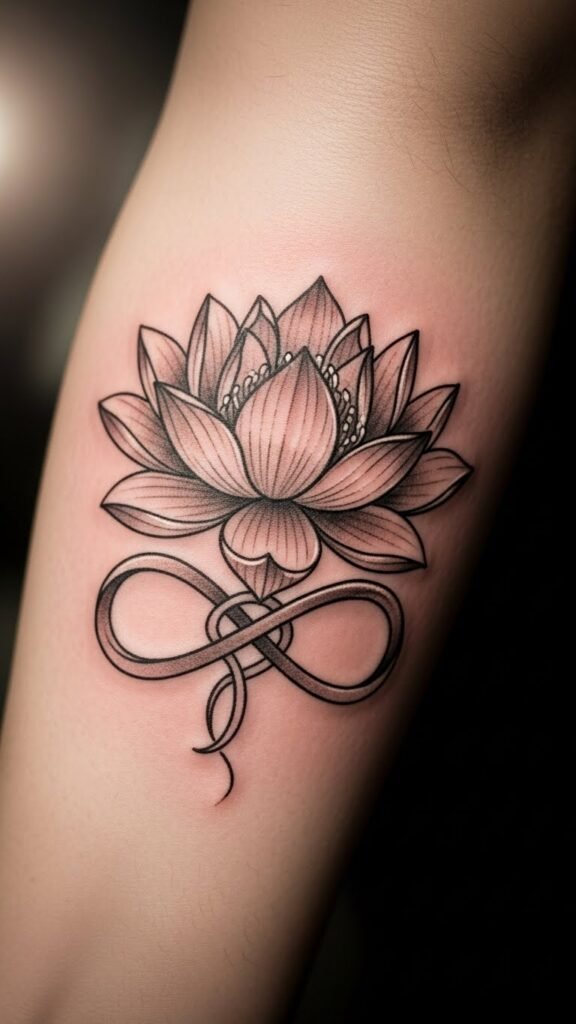 The lotus flower symbolizes purity and resilience, emerging beautifully from muddy waters, while the infinity sign represents eternal love and endless possibilities.