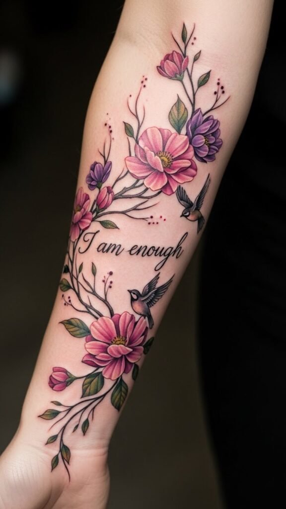 Positioned on the forearm, it serves as a daily reminder of one’s worth and resilience, visible to both the wearer and others. The floral elements represent growth and beauty, reinforcing the idea that embracing oneself is a continual journey.