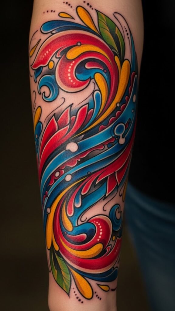 The vibrant colors and flowing design create a dynamic visual that resonates with personal expression and artistic flair.