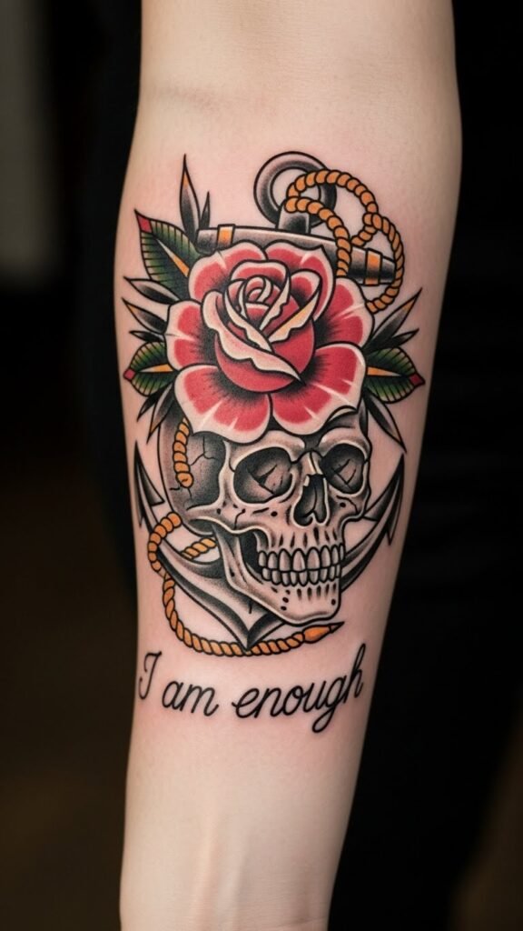 This tattoo design symbolizes resilience and self-acceptance, with the rose representing beauty and love, the anchor symbolizing stability and hope, and the skull signifying mortality and the importance of living fully.