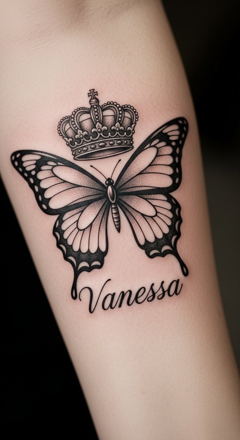 The butterfly signifies transformation and growth, reflecting personal evolution and resilience, while the crown represents strength and a commitment to family.