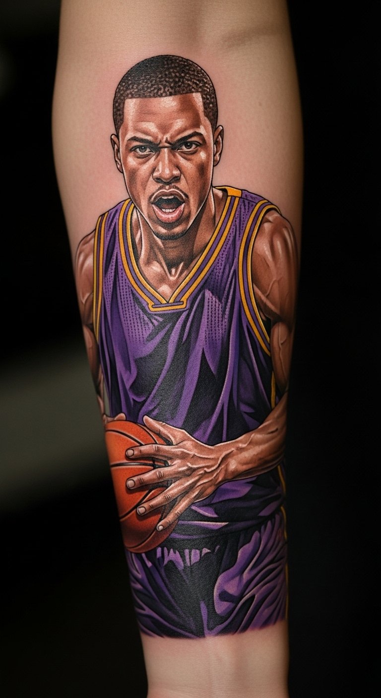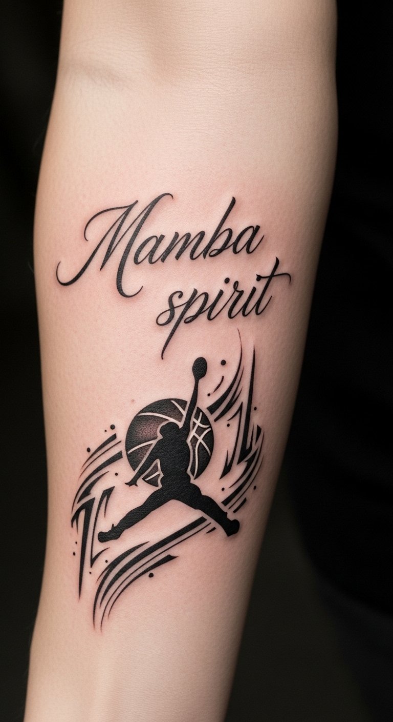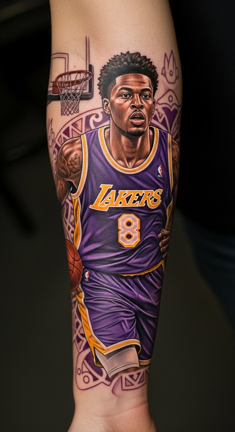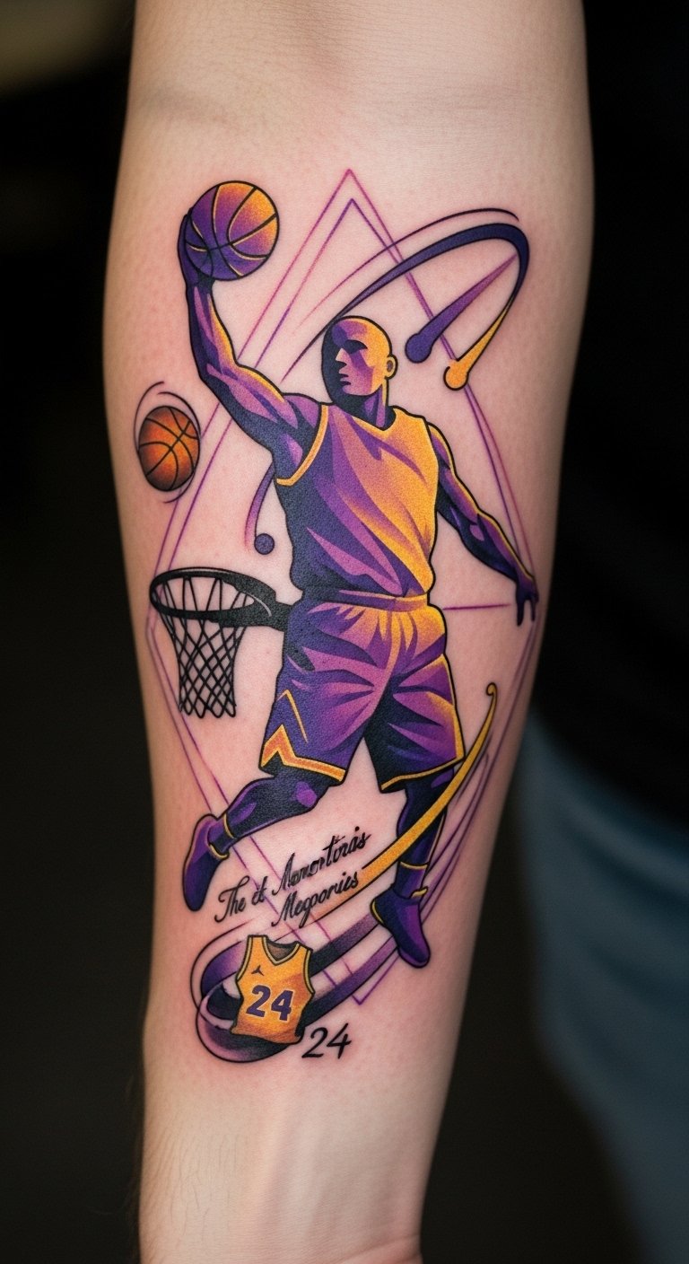 This tattoo embodies a tribute to Kobe Bryant, celebrating his legacy and passion for basketball. Placed on the forearm, it serves as a constant reminder of his influence, allowing fans to carry his spirit with them.