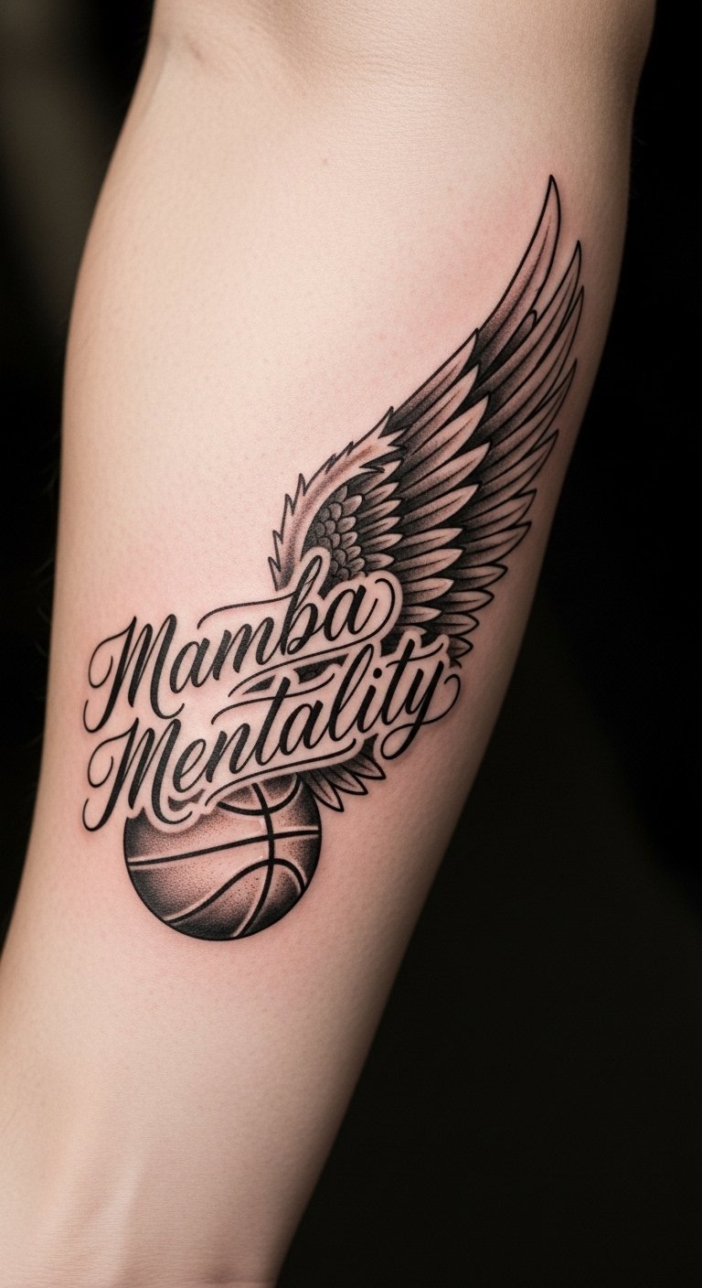 This tattoo symbolizes the relentless drive and resilience embodied in Kobe Bryant’s legacy. The phrase “Mamba Mentality” serves as a daily reminder to strive for excellence, while the basketball and wings represent the freedom and passion that basketball brought to his life.