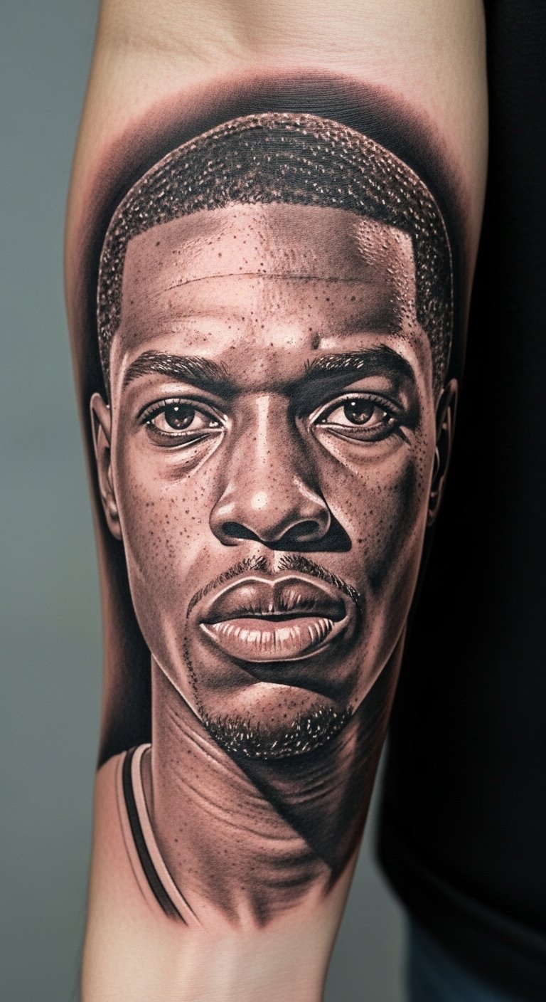 This tattoo design captures the essence of Kobe Bryant’s spirit and dedication, serving as a powerful reminder of his influence. The placement on the upper arm allows for visibility and personal connection, symbolizing strength and resilience. The intricate details of the portrait reflect the deep admiration for his legacy, while the surrounding elements add layers of meaning, celebrating both his athletic prowess and the Mamba Mentality that inspires countless individuals to strive for greatness in their own lives.