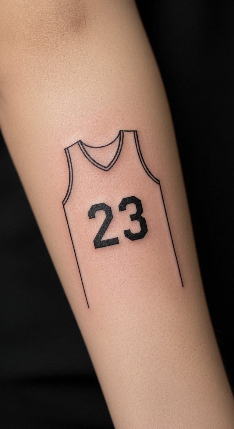This minimalist Kobe jersey number tattoo symbolizes admiration and respect for a basketball legend, capturing the essence of Kobe’s relentless pursuit of excellence.