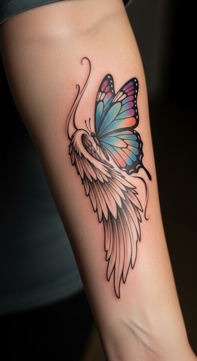 The butterfly symbolizes resilience and change, while the angel wings evoke feelings of guidance and safety.