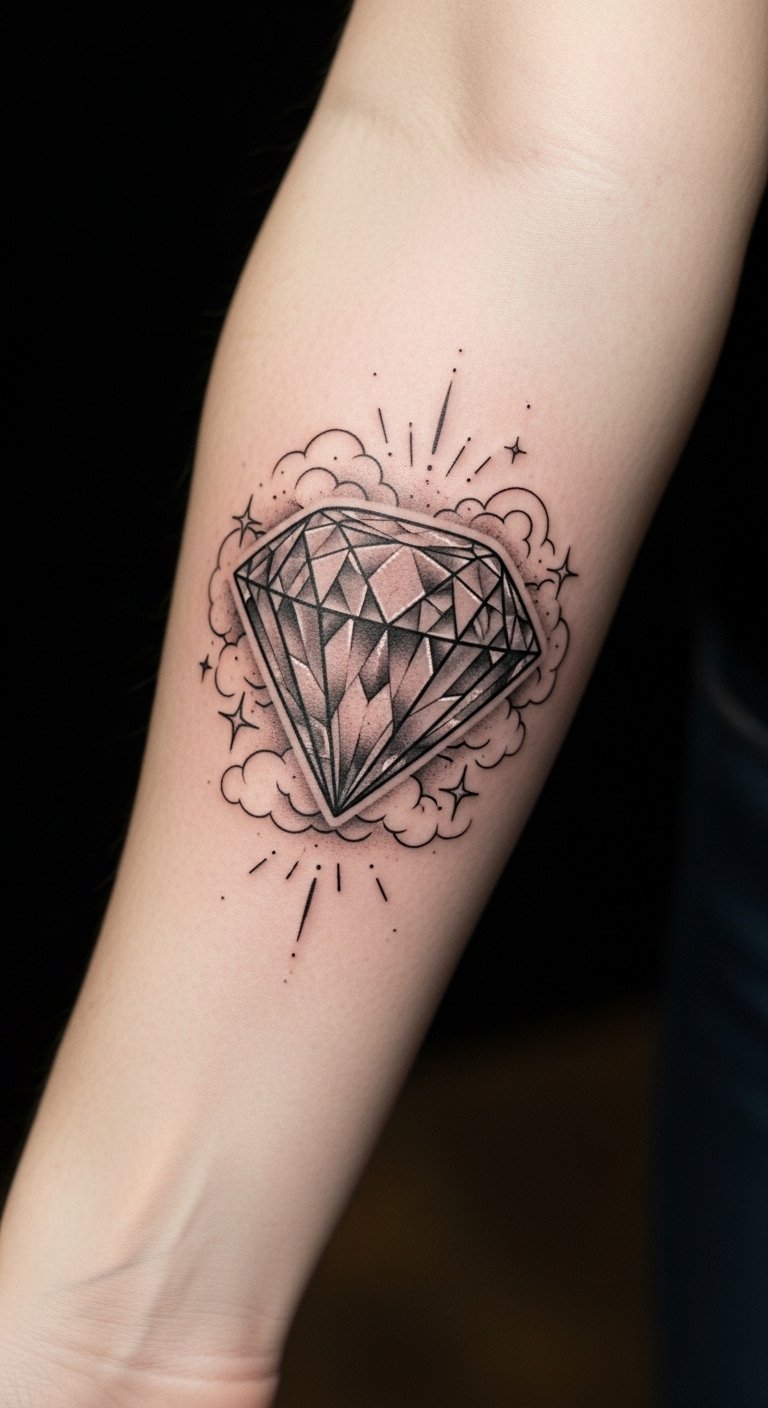 The diamond, symbolizing resilience and brilliance, reflects the journey from humble beginnings to greatness. Its placement on the forearm allows for visibility, making it a personal tribute that connects deeply with the wearer’s roots and aspirations, encouraging them to shine brightly as they pursue their dreams.
