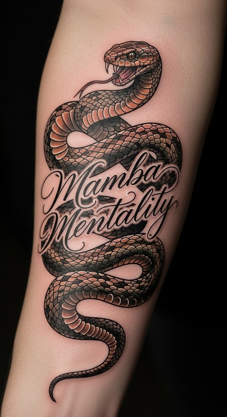 The elegant script of “Mamba Mentality” intertwining with the snake emphasizes the profound connection to Kobe’s legacy, making it a powerful and personal tribute.