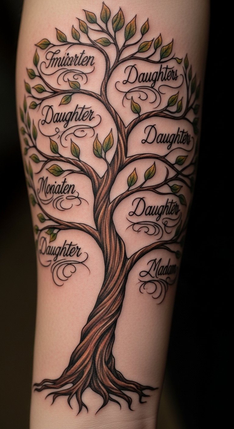 This tattoo symbolizes the deep-rooted love and connection within a family, where each branch represents a daughter’s individuality.