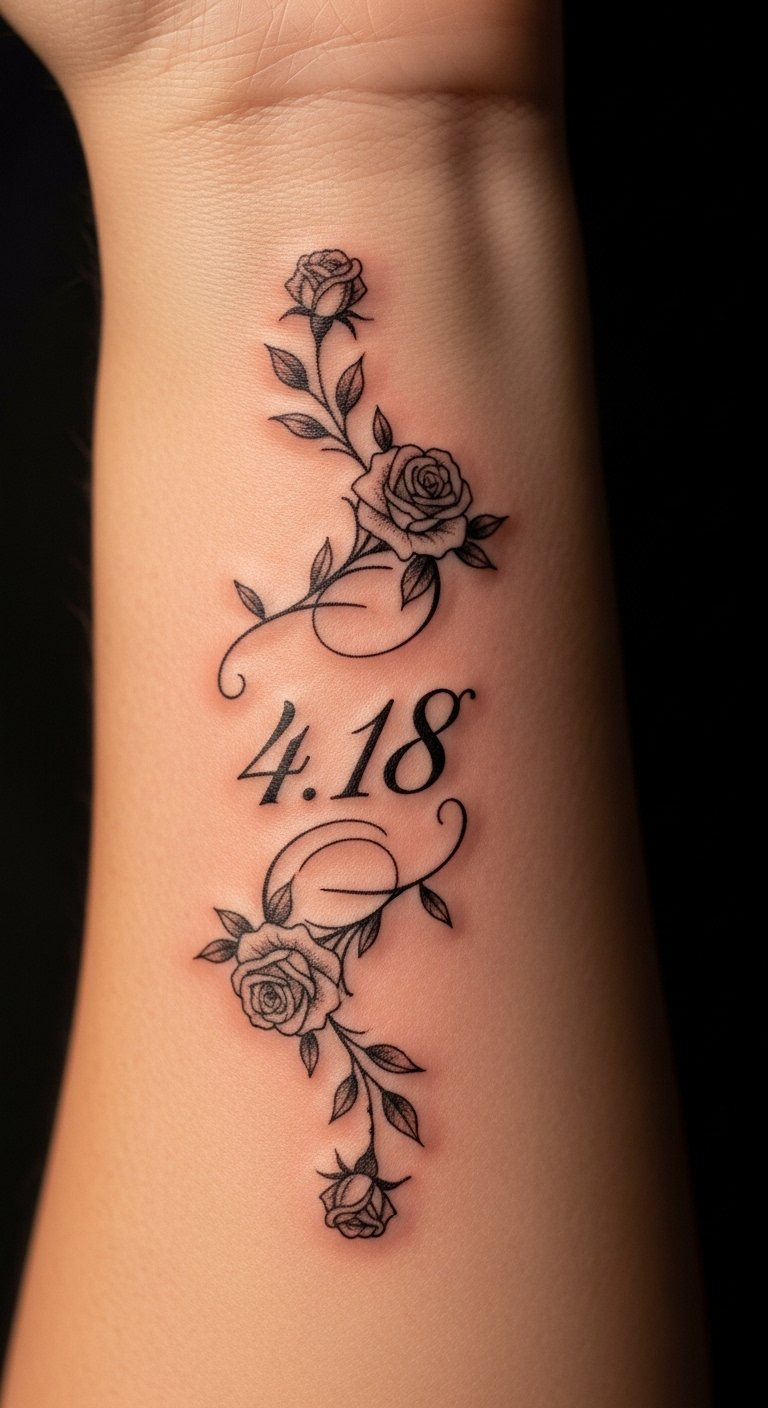The roses entwined with the date reflect beauty, resilience, and the blossoming of their relationship through life’s challenges.