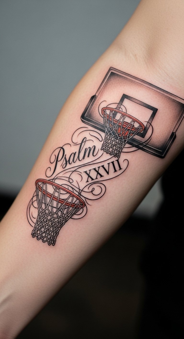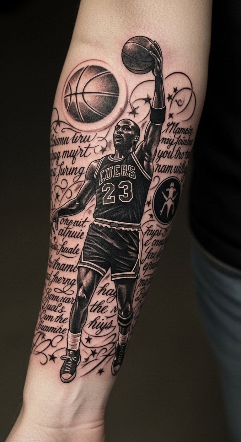 Placed on the forearm, it serves as a daily reminder of personal ambition and resilience, visible to the owner and those around them, fostering motivation and camaraderie among fellow basketball enthusiasts.