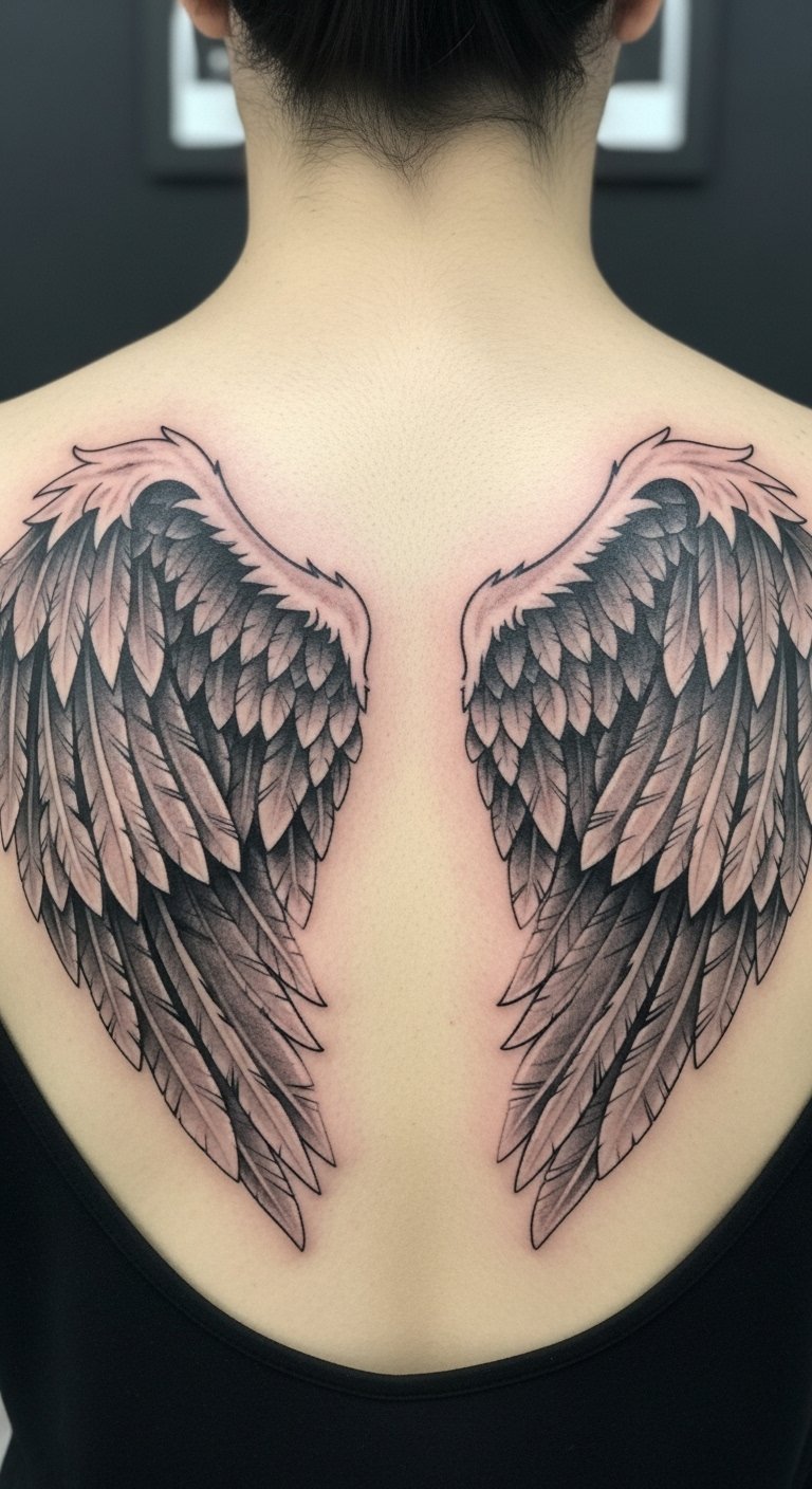 The angel wings tattoo on the upper back serves as a powerful reminder of the protective love that surrounds the wearer.