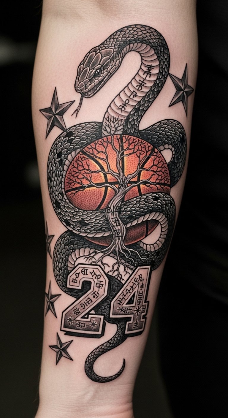This tattoo design honors Kobe Bryant’s legacy by blending symbols of his basketball prowess and familial devotion. The black mamba represents his fierce competitive spirit and Mamba Mentality, while the family tree signifies his dedication to loved ones.