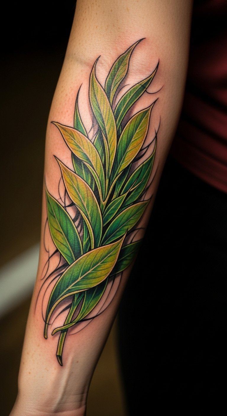 Positioned on the forearm, it serves as a constant reminder of the healing journeys we embark on through nature’s gifts. This placement allows for visibility, sparking conversations about the importance of herbal healing and the stories behind each leaf, while also evoking a sense of personal growth and resilience.