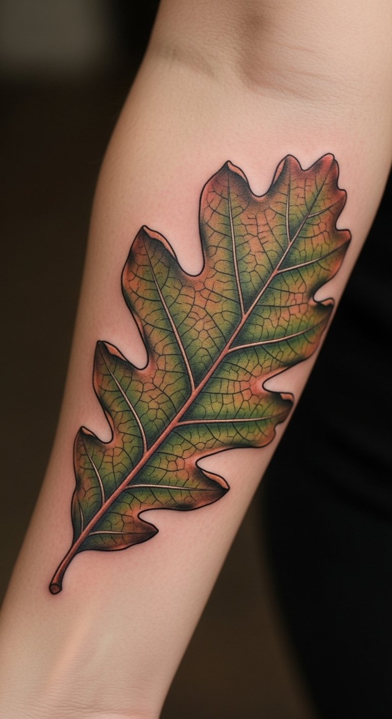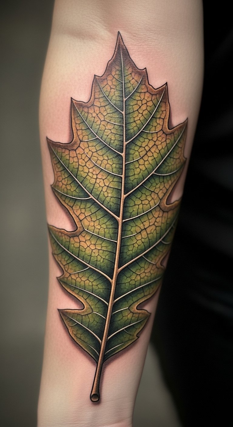 This oak leaf tattoo symbolizes strength and endurance, drawing inspiration from the majestic oak tree’s resilience in nature.