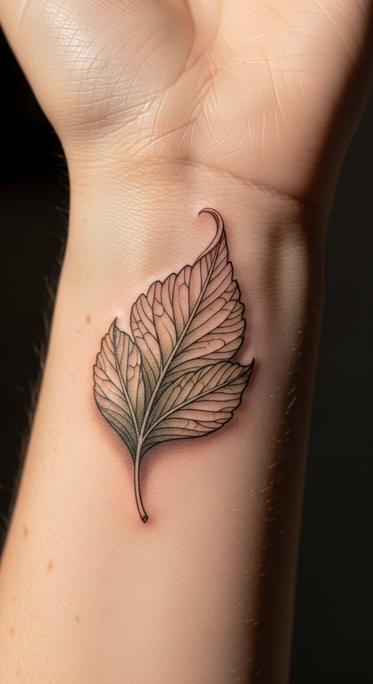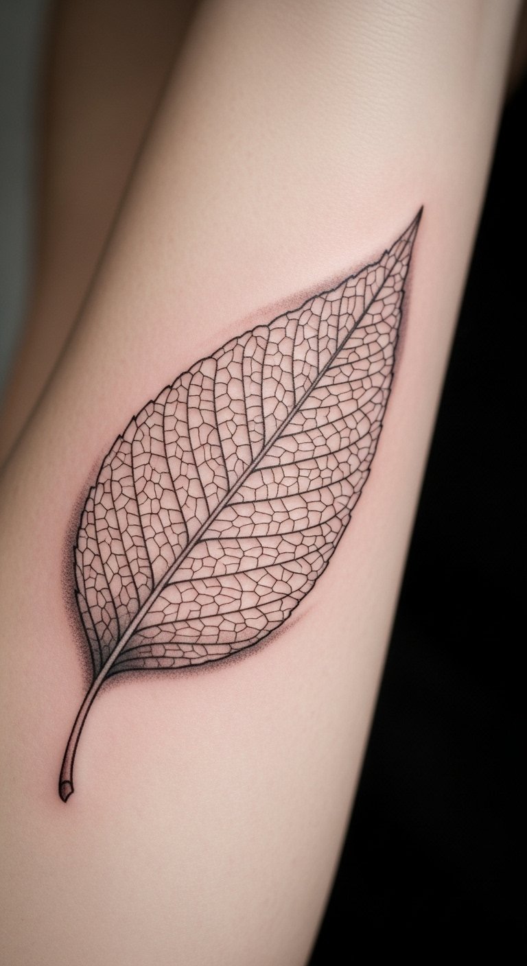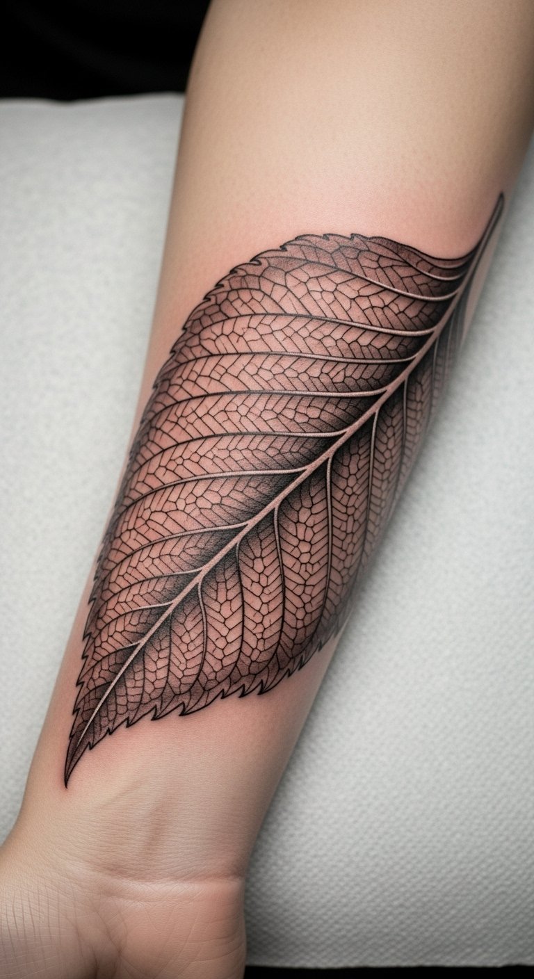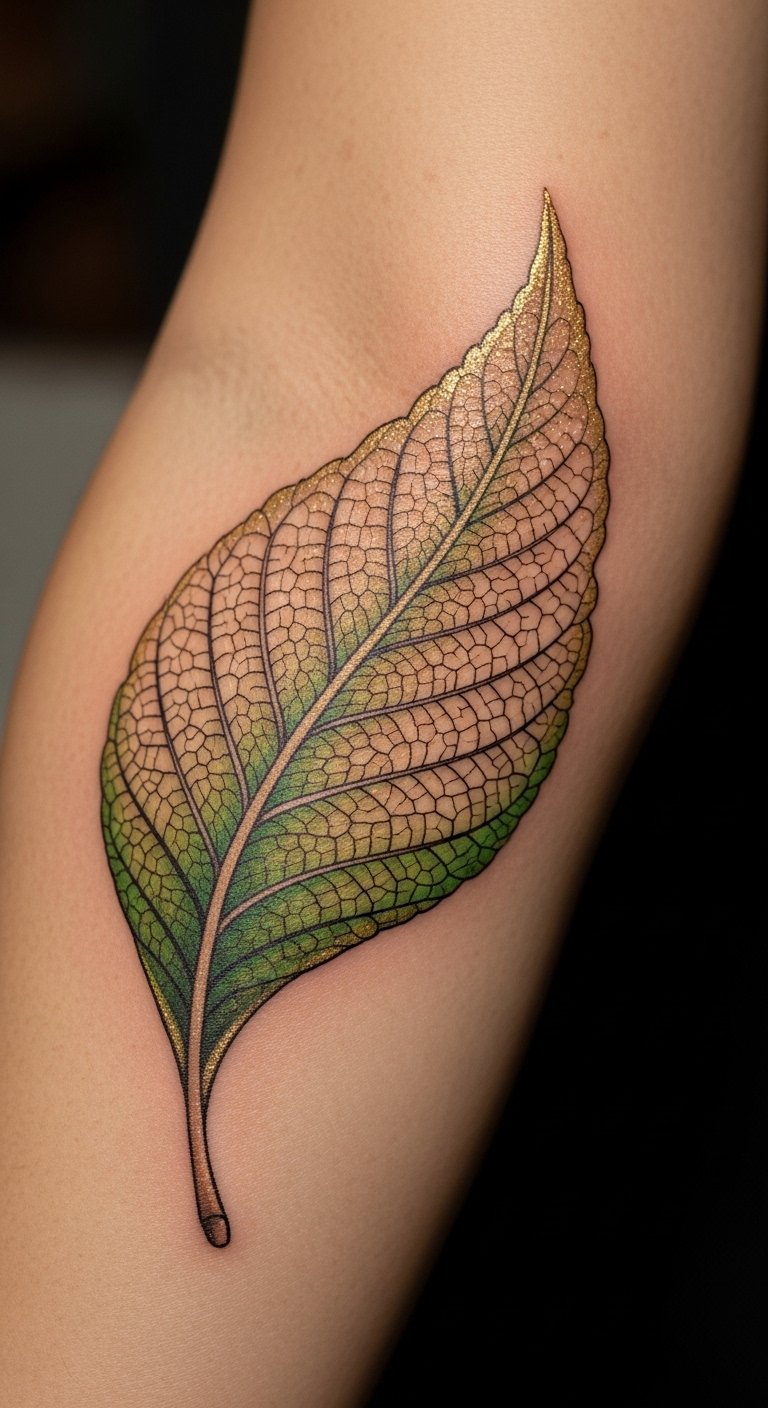 This leaf tattoo on the inner forearm serves as a powerful symbol of growth, renewal, and connection to nature.