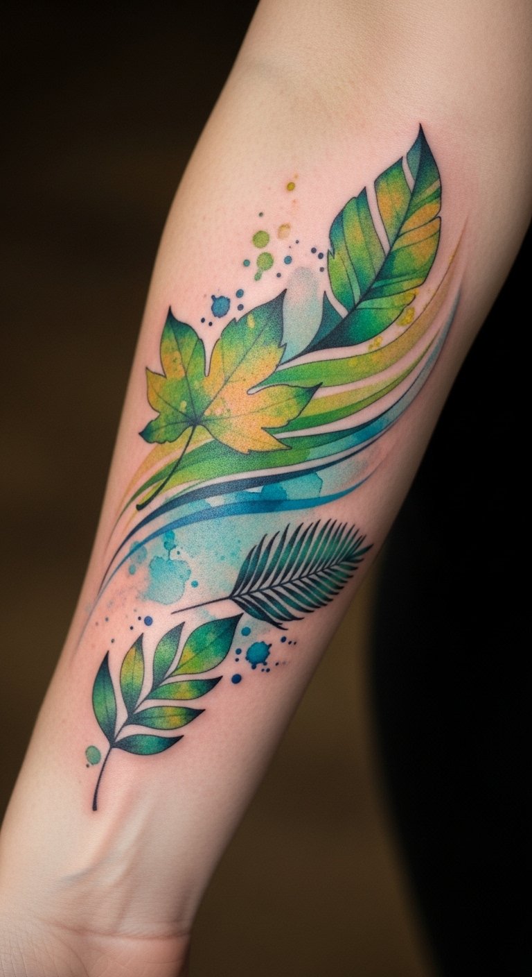 Positioned on the forearm, it serves as a daily reminder of their bond with the earth, making it both personal and visible. The vibrant colors and fluid shapes evoke emotions of freedom and creativity, inviting curiosity and conversation about the natural world and the importance of preserving it.