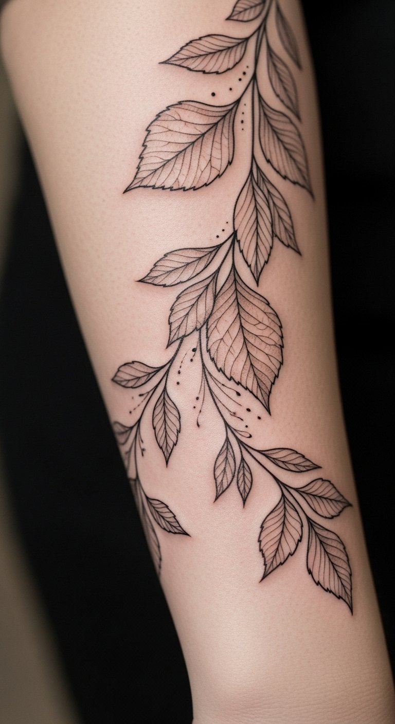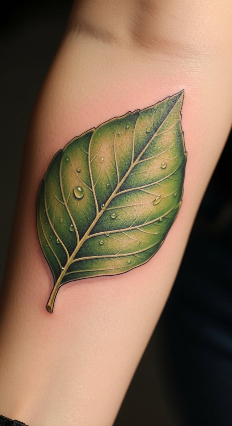 The leaf tattoo on the forearm symbolizes hope and new beginnings, intertwining the wearer’s personal story with cultural roots and ancient beliefs.
