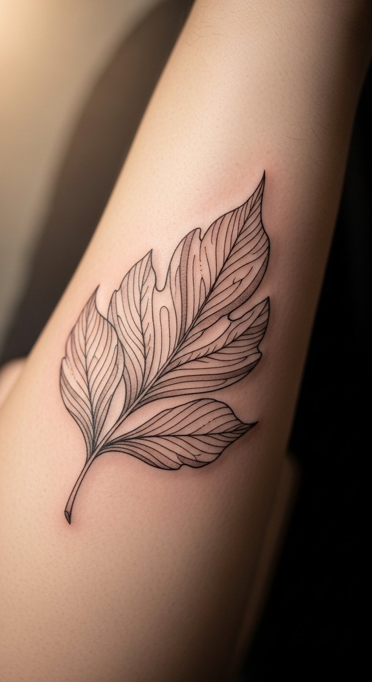 The solitary leaf tattoo embodies strength in solitude, representing personal growth and resilience.