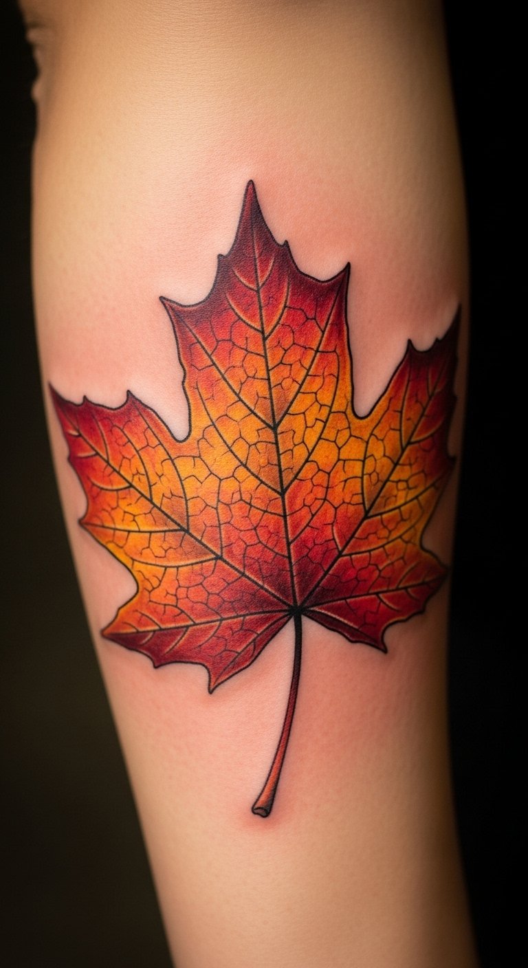 The maple leaf tattoo symbolizes balance and wisdom, reflecting a journey of personal growth and adaptability.